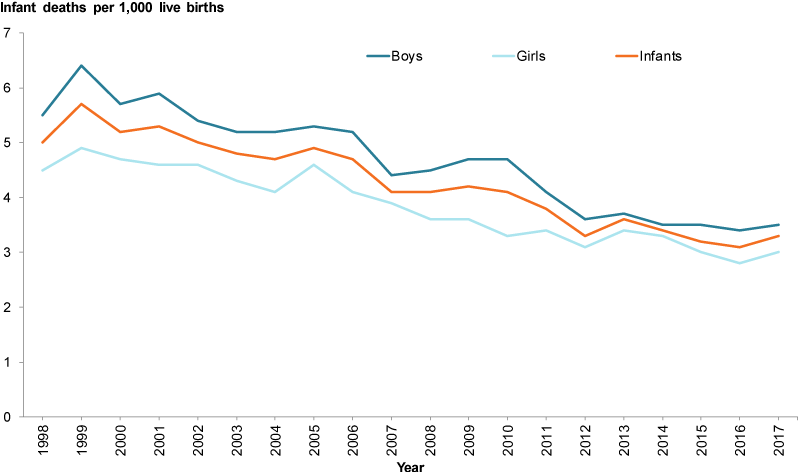 This line graph tracks infant mortality rates by sex over two decades. It shows a steady decline in deaths among both boys and girls, with a reduction from roughly 5 deaths per 1 000 live births in 1998 to about 3.3 per 1 000 in 2017. Although both sexes show improvement, boys consistently have a slightly higher death rate than girls. These trends reflect broad improvements in maternal and infant health while also highlighting persistent gender differences.